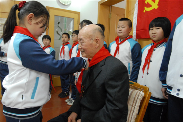 在傅孝先老黨員家中,學(xué)生們給老黨員佩戴上鮮艷的紅領(lǐng)巾,整齊地敬上少先隊隊禮,用自己的方式表達(dá)了對老黨員的敬佩和愛戴之情。傅孝先老黨員為孩子們講述了自己在淮海戰(zhàn)役中馬肚皮藏身急送情報信動人心魄的紅色故事,說起戰(zhàn)斗故事,老人慷慨激昂,有聲有色,仿佛又回到了那個年代,讓孩子們感受一次愛國主義教育。