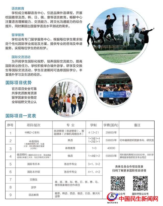 為提升學校國際化教育教學水平,大力培養(yǎng)具有國際化素養(yǎng)的高層次應用型人才,學校先后與莫斯科國立大學、德國德累斯頓大學、英國提賽德大學、烏拉爾聯(lián)邦大學、圣彼得堡彼得大帝理工大學、加拿大萊姆頓學院、澳大利亞南十字星大學、韓國崇實大學、全州大學等等16個國家的60余所高校開展國際交流與合作,優(yōu)質的國際教育資源、濃厚的國際化氛圍和一站式的國際化教育平臺,為學生國際化素養(yǎng)的培養(yǎng)提供了良好條件,學生在畢業(yè)前達到要求,即可申請到國外知名大學攻讀本科或碩士學位。