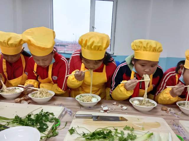 接下來,校長(zhǎng)從握刀、切菜到煮面的火候、時(shí)長(zhǎng)再到調(diào)料的搭配,每一個(gè)環(huán)節(jié)都耐心地講解,手把手地示范著。孩子們專心地聽講,認(rèn)真地練習(xí),從一開始的小心翼翼到后來的熟練操作,在練習(xí)中樹立了信心。