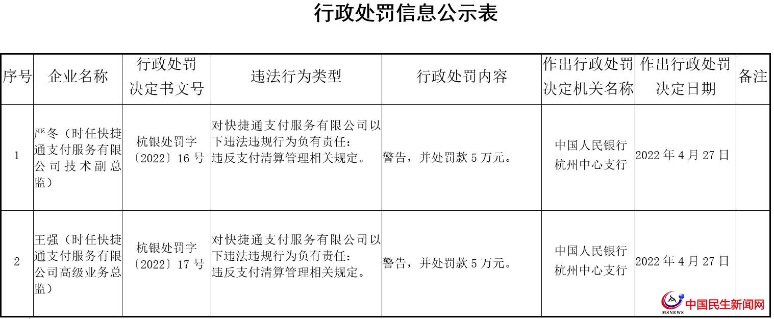 金融虎網(wǎng)注意到,5月10日,快捷通支付兩名管理人員嚴冬和王強均因?qū)?ldquo;違反支付清算管理相關規(guī)定”負有責任,分別被給予警告,并各處罰款5萬元。嚴冬時任快捷通支付服務有限公司技術副總監(jiān),王強時任快捷通支付服務有限公司高級業(yè)務總監(jiān)。