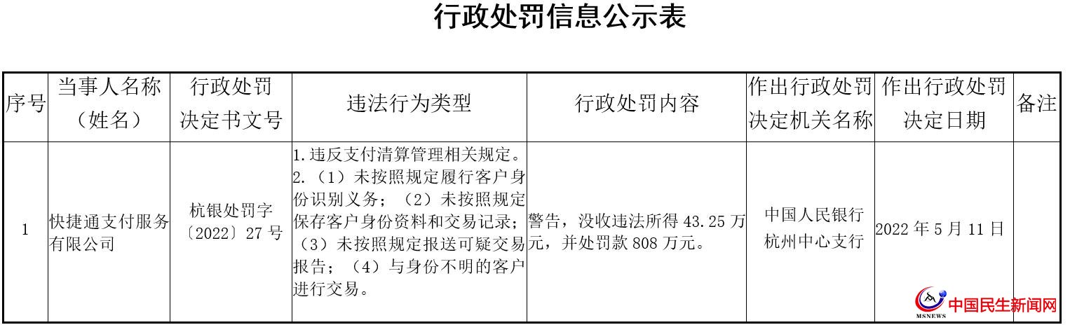 金融虎訊 5月23日消息,近日,央行杭州中心支行公布的行政處罰信息公示表顯示,快捷通支付服務有限公司因違反兩項規(guī)定被給予警告,沒收違法所得43.25萬元,并處罰款808萬元。