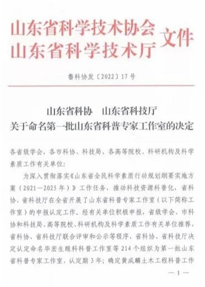 本次認(rèn)定工作系山東省首次舉辦,學(xué)校積極組織申報(bào)、遴選推薦,省科協(xié)、省科技廳聯(lián)合評(píng)審,最終恒星學(xué)院農(nóng)學(xué)院“王凱榮興農(nóng)科技服務(wù)科普工作室”獲首批山東省科普專家工作室認(rèn)定命名;建筑工程學(xué)院“黃成麟土木工程科普工作室”獲首批山東省科普專家工作室培育對(duì)象認(rèn)定命名。