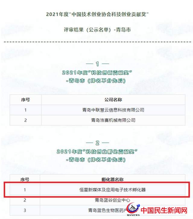 中國(guó)民生新聞網(wǎng)訊 5月7日,中國(guó)技術(shù)創(chuàng)業(yè)協(xié)會(huì)主辦的“2021年度中國(guó)技術(shù)創(chuàng)業(yè)協(xié)會(huì)科技創(chuàng)業(yè)貢獻(xiàn)獎(jiǎng)”評(píng)審結(jié)果正式公示,恒星新媒體及應(yīng)用電子技術(shù)孵化器榜上有名,這是繼榮獲2021年度國(guó)家級(jí)科技企業(yè)孵化器后的又一項(xiàng)國(guó)家級(jí)殊榮。