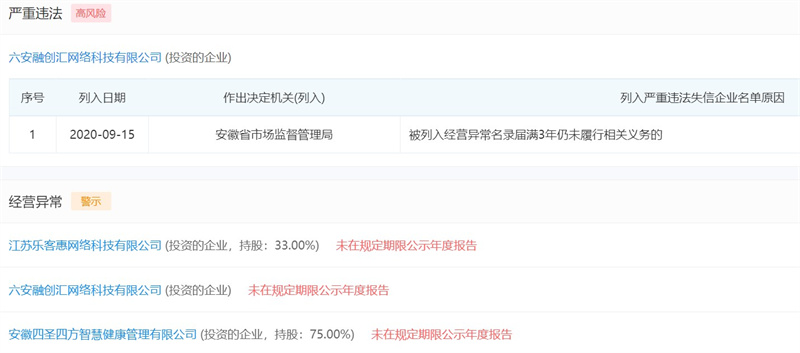 鄧賢炳名下的其他企業(yè)也是問題重重,多家企業(yè)因未在規(guī)定期限公示年度報告而被當(dāng)?shù)乇O(jiān)管部門列入經(jīng)營異常名錄,值得一提的是,由他投資的六安融創(chuàng)匯網(wǎng)絡(luò)科技有限公司更是早已被安徽省市場監(jiān)督管理局列入嚴(yán)重違法企業(yè)名錄之內(nèi)。據(jù)統(tǒng)計,目前由他擔(dān)任法定代表人的企業(yè)共有4家,其中3家已經(jīng)注銷;由他投資的企業(yè)共有7家,其中有3家已然注銷,還有兩家已處于吊銷的經(jīng)營狀態(tài)。