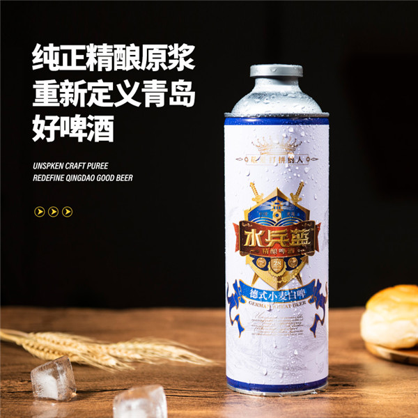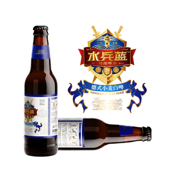 在商標(biāo)的設(shè)計(jì)上,他主要用藍(lán)色的色調(diào)、藍(lán)色的盾牌作為背景,上面插著兩把利劍,并把軍艦的瞭望塔、鐵錨、青島棧橋、啤酒等元素融入,前面紅色的飄帶上面像有古典盾牌字樣“水兵藍(lán)”三個(gè)大字,配有精釀啤酒,彰顯大氣。據(jù)周學(xué)禮介紹,青島的啤酒史已有一百多年,啤酒的“啤”字,還是青島人的發(fā)明,青島啤酒在顧客的心中“口碑”非常好,用口品嘗,直接將“碑”字“石”字旁改成“口”字旁,從而形成今天的“啤”字。哈啤酒、吃海鮮,一直也是青島人引以為豪的事。啤酒又是大眾化消費(fèi)的首選飲料,因此,他決定出一款啤酒飲料,與兵還能沾邊,還能與戰(zhàn)友們分享。
