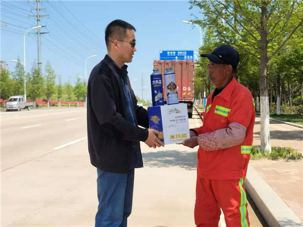 中國民生新聞網(wǎng)訊 (記者 素素)今天上午,在青島西海岸新區(qū)軍民融合區(qū)附近的道路上,一群辛勤打掃馬路的清潔工人收到了一份特殊的“禮物”,青島“水兵藍”啤酒公司向他們贈送了“五一”節(jié)的禮品。品嘗著沁人心脾的啤酒,他們禁不住豎起了大拇指。