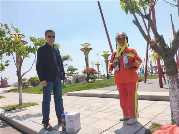 “水兵藍”品牌創(chuàng)始人周學禮說:“五一節(jié)期間,這些環(huán)衛(wèi)工作還一直戰(zhàn)斗在一線,為了能讓游客看到潔凈的馬路,他們一直在做著重復的勞動,非常辛苦,他們是最美勞動者。自己本身是一名退役軍人,對他們的奉獻精神表示贊賞,用自己精釀的啤酒來慰問他們,希望給他們帶來五一的快樂時光。
