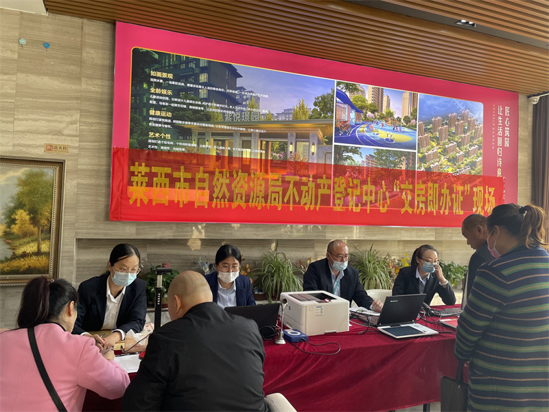 據(jù)悉,“交房即辦證”工作是萊西市學(xué)史力行,深入推進(jìn)“互聯(lián)網(wǎng)+不動(dòng)產(chǎn)登記”的一項(xiàng)重要舉措。為更好的服務(wù)企業(yè)和群眾,讓百姓買房省心、辦證舒心,萊西市創(chuàng)新“聯(lián)合驗(yàn)收”,統(tǒng)籌多個(gè)部門共同參與,由原來的坐等服務(wù)到現(xiàn)在的上門服務(wù),由原來“折返跑”多部門到現(xiàn)在的多部門集中辦公服務(wù),不僅壓縮了工作流程,而且減少了工作時(shí)限。在紫悅璟園小區(qū)交房現(xiàn)場,工作人員通過“一人一機(jī)一窗”新模式受理業(yè)主不動(dòng)產(chǎn)登記申請,經(jīng)不動(dòng)產(chǎn)登記和稅務(wù)部門后臺(tái)人員審核后,申請人在交房現(xiàn)場繳納稅費(fèi)后直接領(lǐng)到不動(dòng)產(chǎn)權(quán)證書。兩天時(shí)間,共計(jì)76戶業(yè)主在現(xiàn)場辦理不動(dòng)產(chǎn)登記手續(xù)并領(lǐng)取了證書。