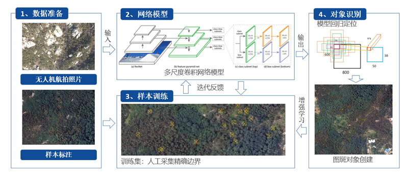 通過監(jiān)測普查摸清疫情發(fā)生底數是科學制定防治方案的前提條件,但常規(guī)普查監(jiān)測耗時長、難度大、成本高,數據實時性和準確性也存在一定局限。為進一步提升防治能力,貫徹落實智慧防治理念,由嶗山區(qū)自然資源局、北京航空航天大學青島研究院聯合攻關,通過融合0.05米高分辨率無人機技術、北斗高精度導航技術和人工智能技術,對無人機獲取的高精度圖片進行智能化分析處理,精準識別監(jiān)測松材線蟲病疫情發(fā)生情況,逐步構建形成了“精準監(jiān)測”“精準識別”“精準評估”和“精準監(jiān)管”四位一體的松材線蟲病空天地一體化精準飛巡監(jiān)測體系,并申報山東省自然資源科學技術獎。