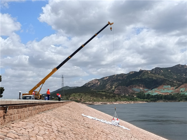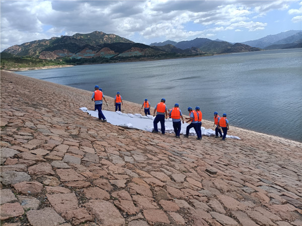 壩前護坡坍塌滑坡?lián)岆U演練現(xiàn)場,無人機空中巡檢發(fā)現(xiàn)主壩迎水坡位置出現(xiàn)坍塌滑坡,搶險隊員立即兵分兩路,一路在迎水坡鋪設(shè)土工布覆蓋滑坡體區(qū)域,用沙袋將土工布壓實,另一路將沙袋搬運至吊籠,由吊車將沙袋投放至滑坡體下方,防止坍塌及滑坡進一步發(fā)展。經(jīng)過搶險隊員的共同努力,護坡坍塌滑坡被及時處置,險情得到有效控制。
