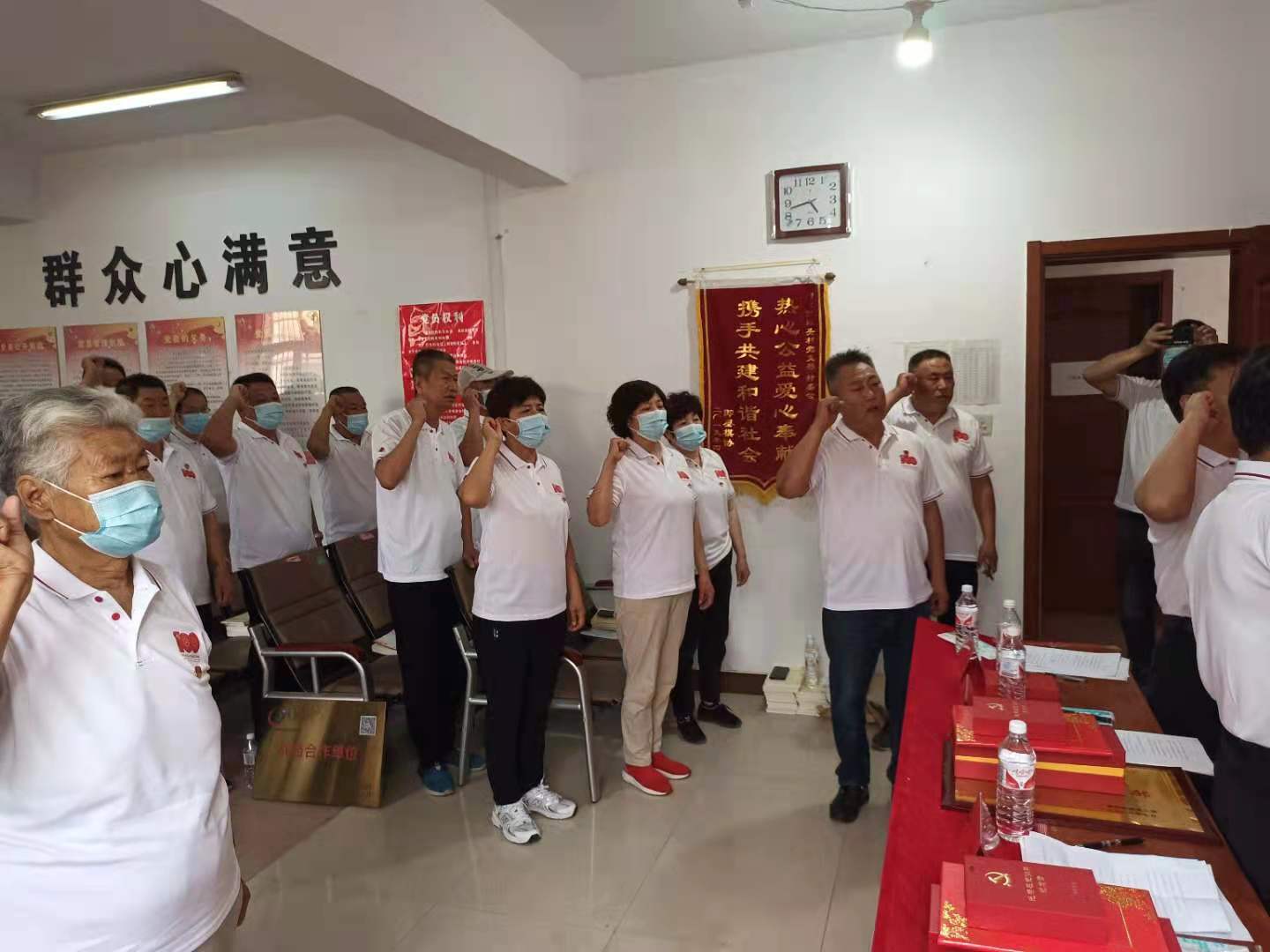 上午九時許,黨員們莊嚴地舉起右手,跟著村書記李洪勇帶領(lǐng)全體黨員干部重溫了入黨誓詞。在熱烈的掌聲中,他們?yōu)槿朦h五十年的老黨員頒發(fā)了獎?wù)拢弥恋榈榈莫務(wù)拢宵h員們個個樂得合不攏嘴。緊接著,他們還為支部選出來的優(yōu)秀黨員頒發(fā)了獎?wù)潞酮劚?,這個象征100周年的獎杯尤其惹人注目。