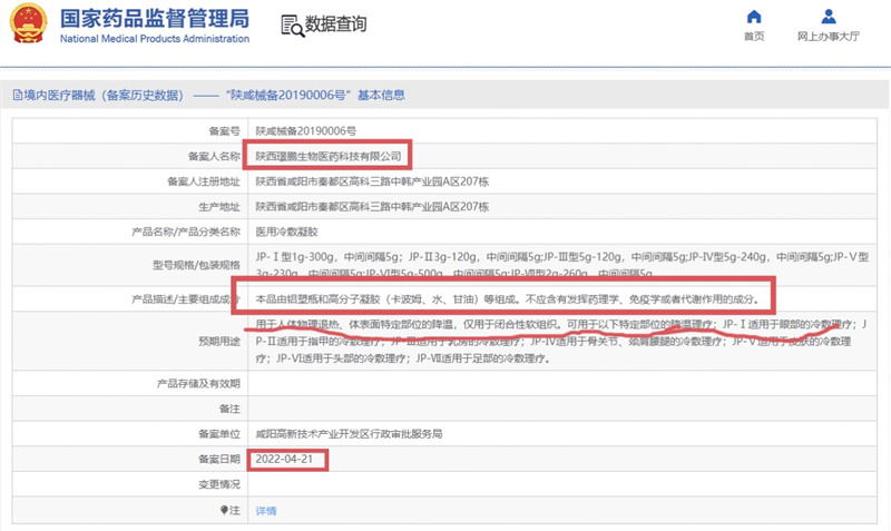 由代理提供的產(chǎn)品備案信息可看到,“御京盛·醫(yī)用冷敷凝膠”的產(chǎn)品備案號(hào)為:陜咸械備20190006號(hào)。在國(guó)家藥品監(jiān)督管理局官網(wǎng)查詢?cè)搨浒柑?hào)得到的信息是,該產(chǎn)品的備案人是陜西璟鵬生物醫(yī)藥科技有限公司,備案日期是2022年4月21日,也就是說,該產(chǎn)品是陜西璟鵬生物醫(yī)藥科技有限公司代加工生產(chǎn)的。并且,該產(chǎn)品屬于第一類醫(yī)療器械,由鋁塑瓶和高分子凝膠(卡波姆、水、甘油)等組成,不應(yīng)含有發(fā)揮藥理學(xué)、免疫學(xué)或者代謝作用的成分。用于人體物理退熱、體表面特定部位的降溫,僅用于閉合性軟組織,適用于眼部的冷敷理療。由此可見,“御京盛·醫(yī)用冷敷凝膠”并不具備其所宣傳的治療各種眼疾、近視的效果,其有關(guān)宣傳材料明顯存在醫(yī)療器械廣告宣傳的功能主治、適用范圍超出了批準(zhǔn)的內(nèi)容,含有不科學(xué)地表示功效的斷言和保證,嚴(yán)重欺騙和誤導(dǎo)消費(fèi)者。