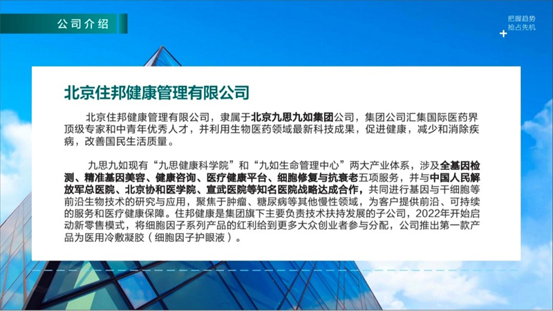據(jù)資料宣傳,2019年7月25日,王某偉成立九思九如健康科技有限公司,公司匯集國(guó)際醫(yī)藥界優(yōu)秀專家和中青年科技人才,利用生物醫(yī)藥領(lǐng)域高新科技成果服務(wù)于人類,促進(jìn)健康、減少和消除疾病、改善生活質(zhì)量;2021年8月24日,九思九如健康產(chǎn)業(yè)管理有限公司成立,搭建大健康管理平臺(tái),服務(wù)全國(guó)高端人士,涉及全基因檢測(cè)、精準(zhǔn)基因美容、健康咨詢、醫(yī)療健康平臺(tái)、細(xì)胞修復(fù)與抗衰老五項(xiàng)增值服務(wù);2022年,旗下成立北京住邦健康管理有限公司,運(yùn)用國(guó)內(nèi)外先進(jìn)的干細(xì)胞醫(yī)學(xué)研究成果,結(jié)合獨(dú)家專利“干細(xì)胞常溫技術(shù)”,十多位國(guó)際頂尖醫(yī)學(xué)團(tuán)隊(duì)共同研發(fā)打造并推出干細(xì)胞(細(xì)胞因子)健康產(chǎn)品系列。