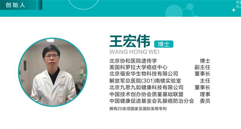 據(jù)代理宣傳,王某偉身上具有多重光環(huán)。他不僅是北京某醫(yī)院遺傳學(xué)博士,還是美國(guó)科羅拉大學(xué)癌癥中心副主任、某總醫(yī)院(301)南樓實(shí)驗(yàn)室主任、中國(guó)技術(shù)創(chuàng)辦協(xié)會(huì)質(zhì)量基礎(chǔ)聯(lián)盟理事、中國(guó)健康促進(jìn)基金會(huì)乳腺癌防治分會(huì)委員,擁有20余項(xiàng)國(guó)家及國(guó)際發(fā)明專利。