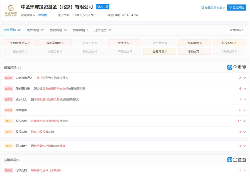 值得注意的是,中金環(huán)球投資基金集團(tuán)的主公司中金環(huán)球投資基金(北京)有限公司曾因執(zhí)行異議之訴案由被起訴3次;因未按時(shí)履行法律義務(wù)被法院強(qiáng)制執(zhí)行1次;因企業(yè)自身未履行法定義務(wù)被限制高消費(fèi)6次;因違反《中華人民共和國(guó)公司登記管理?xiàng)l例》(2016)第六十七條被行政處罰,吊銷執(zhí)照(登記證);涉及6起終本案件,被法院列為了失信被執(zhí)行人,凍結(jié)股東股權(quán)盒其他企業(yè)持有股權(quán)(其中就包含北京福安華生物科技有限公司)。