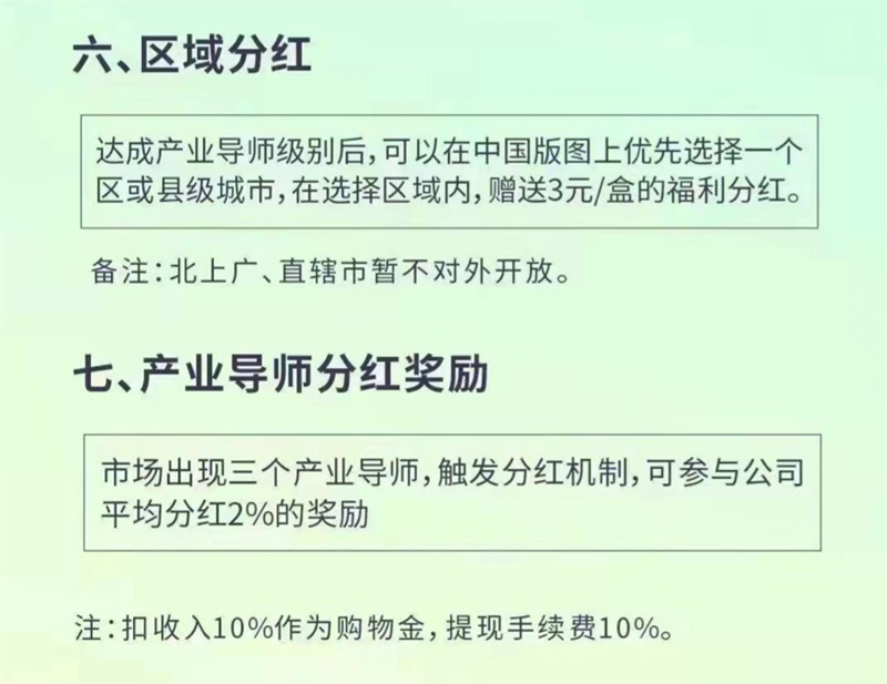 區(qū)域分紅獎(jiǎng)勵(lì):達(dá)成產(chǎn)業(yè)導(dǎo)師級(jí)別后,可以在中國(guó)版圖上優(yōu)先選擇一個(gè)區(qū)或縣級(jí)城市(除北上廣、直轄市以外),在選擇區(qū)域內(nèi),每銷售一盒產(chǎn)品,都可以獲得3元/盒的福利分紅。