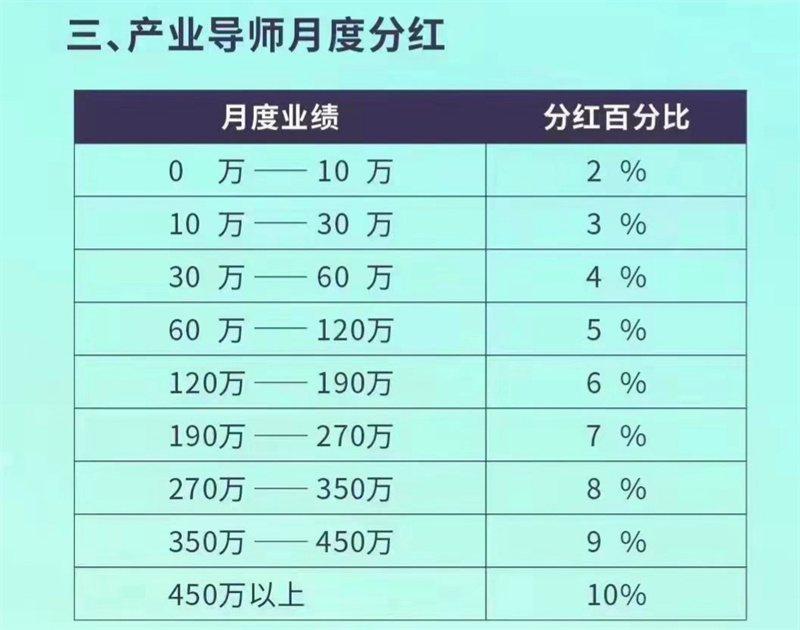 團(tuán)隊(duì)業(yè)績(jī)分紅獎(jiǎng)勵(lì):產(chǎn)業(yè)導(dǎo)師的團(tuán)隊(duì)月總業(yè)績(jī)?cè)?~10萬(wàn)之間,可獲得團(tuán)隊(duì)月總業(yè)績(jī)2%的分紅;團(tuán)隊(duì)月總業(yè)績(jī)?cè)?0~30萬(wàn)之間,可獲得團(tuán)隊(duì)月總業(yè)績(jī)3%的分紅;團(tuán)隊(duì)月總業(yè)績(jī)?cè)?0~60萬(wàn)之間,可獲得團(tuán)隊(duì)月總業(yè)績(jī)4%的分紅;團(tuán)隊(duì)月總業(yè)績(jī)?cè)?0~120萬(wàn)之間,可獲得團(tuán)隊(duì)月總業(yè)績(jī)5%的分紅;團(tuán)隊(duì)月總業(yè)績(jī)?cè)?20~190萬(wàn)之間,可獲得團(tuán)隊(duì)月總業(yè)績(jī)6%的分紅;團(tuán)隊(duì)月總業(yè)績(jī)?cè)?90~270萬(wàn)之間,可獲得團(tuán)隊(duì)月總業(yè)績(jī)7%的分紅;團(tuán)隊(duì)月總業(yè)績(jī)?cè)?70~350萬(wàn)之間,可獲得團(tuán)隊(duì)月總業(yè)績(jī)8%的分紅;團(tuán)隊(duì)月總業(yè)績(jī)?cè)?50~450萬(wàn)之間,可獲得團(tuán)隊(duì)月總業(yè)績(jī)9%的分紅;團(tuán)隊(duì)月總業(yè)績(jī)超過450萬(wàn),可獲得團(tuán)隊(duì)月總業(yè)績(jī)10%的分紅。
