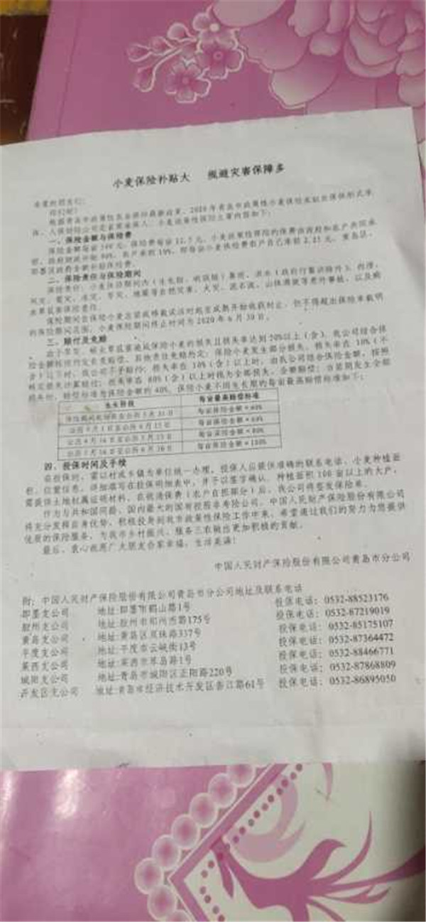 “我們當(dāng)時都很納悶,打聽了一下我們幾個鄰村,他們是減產(chǎn)70%,每畝地得到了350元的賠償,我們的這個標準怎么就不一樣呢?”帶著疑問,田先生找到村書記,他們一起找到中國人保萊西支公司問了問,對方答復(fù)他們村是按照125元/畝的標準進行的賠償。“我們問他們?yōu)槭裁磿羞@個標準,這個標準是誰定的,他們給我們答復(fù)說是專家定的,真奇了怪了,我們周邊的村莊都沒有按照這個標準賠償,為什么單單我們村就是這個標準?”田先生說他們村的村民為了這個事多次找到社區(qū)、政府和信訪辦,甚至打了12345政務(wù)服務(wù)熱線,直到現(xiàn)在沒有個正式的說法,一直也沒有人為他們村的雙重標準幫助協(xié)調(diào),只有村里剛上任沒多久的書記在不停奔走尋求解決,但是一直收效甚微。