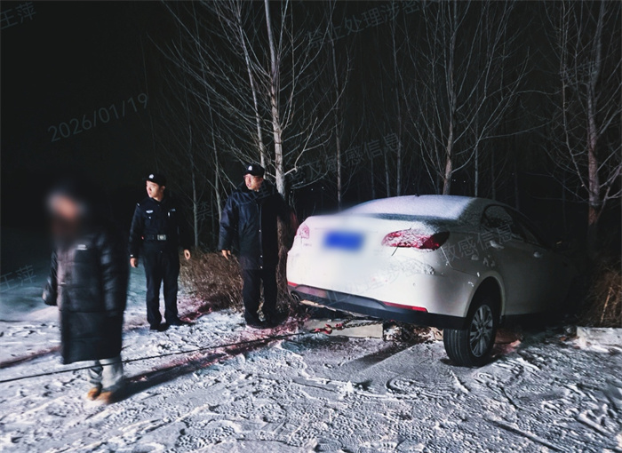 與此同時(shí),恰好有一輛巡邏警車(chē)在事發(fā)地點(diǎn)附近,在接到求助任務(wù)后,巡邏隊(duì)員迅速掉頭趕往事發(fā)地進(jìn)行救援。到達(dá)現(xiàn)場(chǎng)后民警發(fā)現(xiàn),一輛白色轎車(chē)車(chē)頭已經(jīng)落入溝內(nèi),雖然大部分車(chē)身還在溝外,但由于天氣還在落雪,地面積雪隨時(shí)可能讓車(chē)胎打滑發(fā)生二次險(xiǎn)情,救援行動(dòng)必須立刻開(kāi)展。
