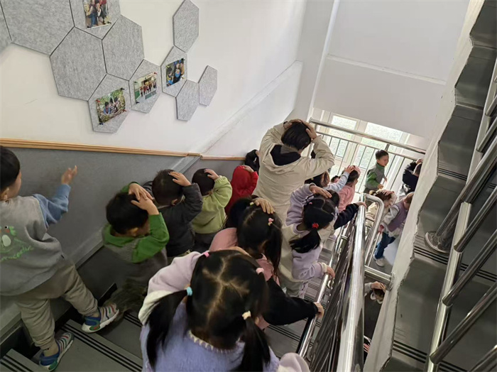 第二階段警報響起“疏散”,各班教師迅速組織幼兒雙手護(hù)頭,彎腰,按照逃生路線快速有序地緊急撤離到幼兒園操場上。在撤離過程中教師們確保每位幼兒的安全,防止發(fā)生踩踏事故。